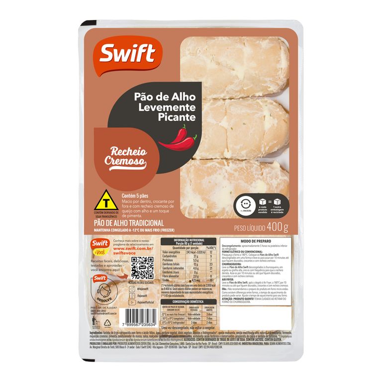 Macio por dentro, crocante por fora e com um delicioso recheio cremoso, o Pão de Alho Picante Swift é ideal para quem aprecia um tempero levemente apimentado. Indispensável em qualquer churrasco, também fica irresistível assado no forno para um lanche rápido e prático.